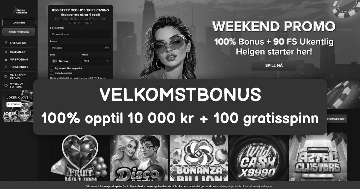 Trips Casino har profilert seg med en stor velkomstpakke som – for enkelte markeder – kommuniseres som opptil €13 000 + 360 gratis spinn. Detaljer som eksakt prosent, fordeling over flere innskudd og NOK‑ekvivalent kan variere for norske spillere. Sjekk derfor alltid den norske kampanjesiden i pålogget visning før du takker ja.